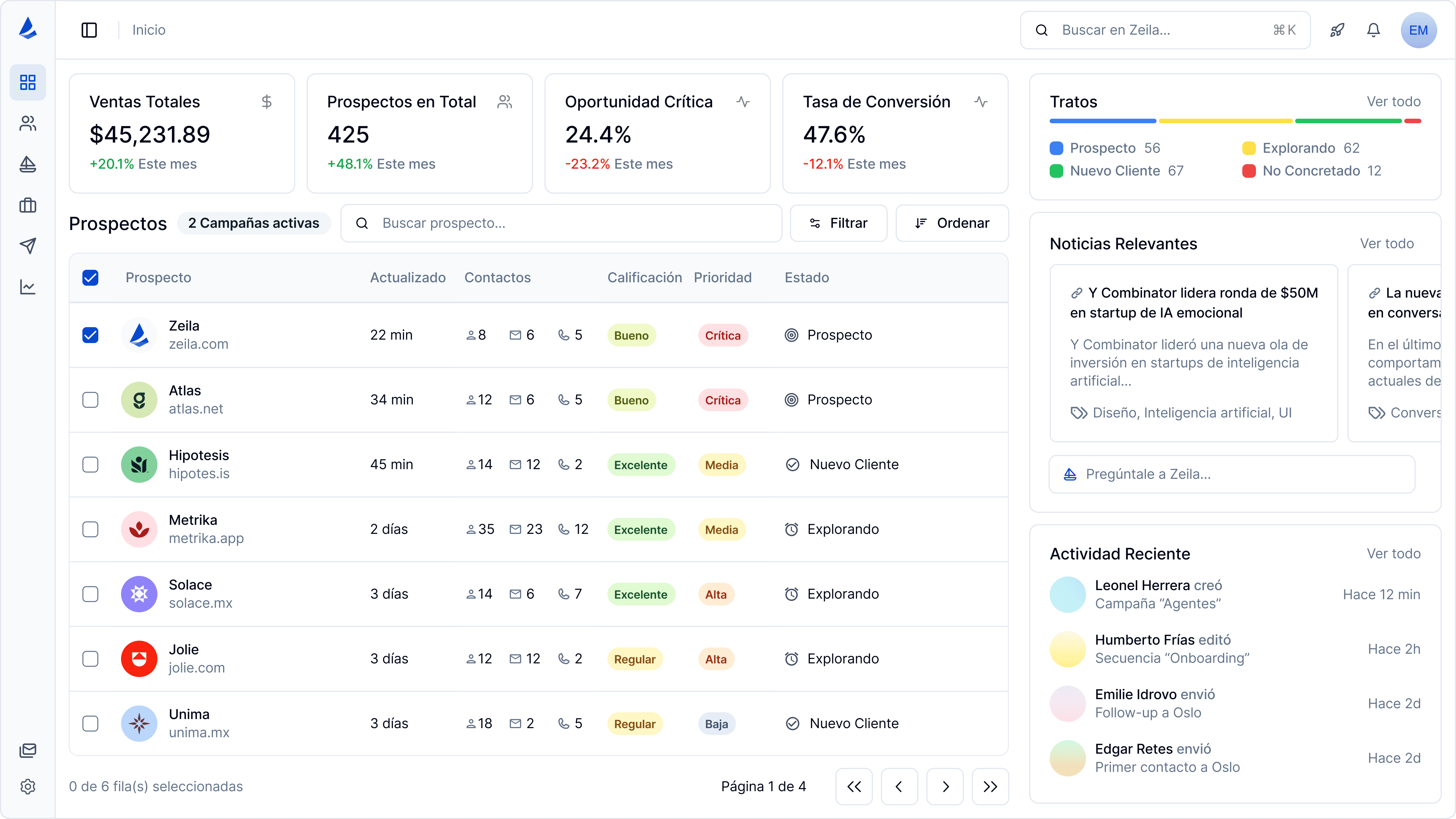 Incluso si estás dando tus primeros pasos en ventas, con Zeila puedes crear un sistema efectivo para ampliar tu alcance, cerrar tus primeras oportunidades y escalar tus esfuerzos comerciales.