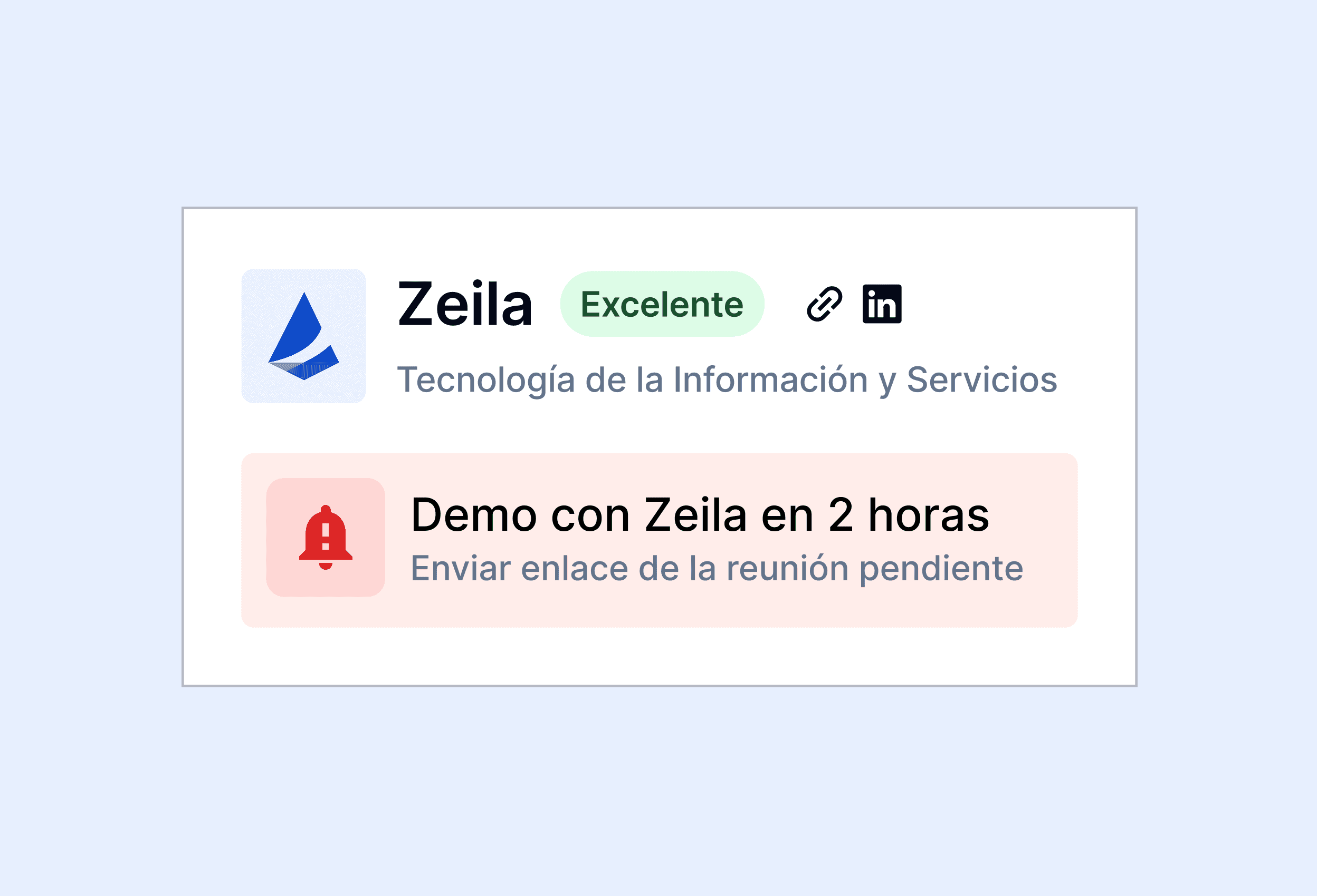 Zeila mantiene todo tu flujo comercial bajo control, enviando notificaciones sobre cambios importantes en prospectos, fechas clave, próximos pasos y señales de interés. Así tu equipo puede priorizar acciones, actuar en el momento justo y nunca perder oportunidades.